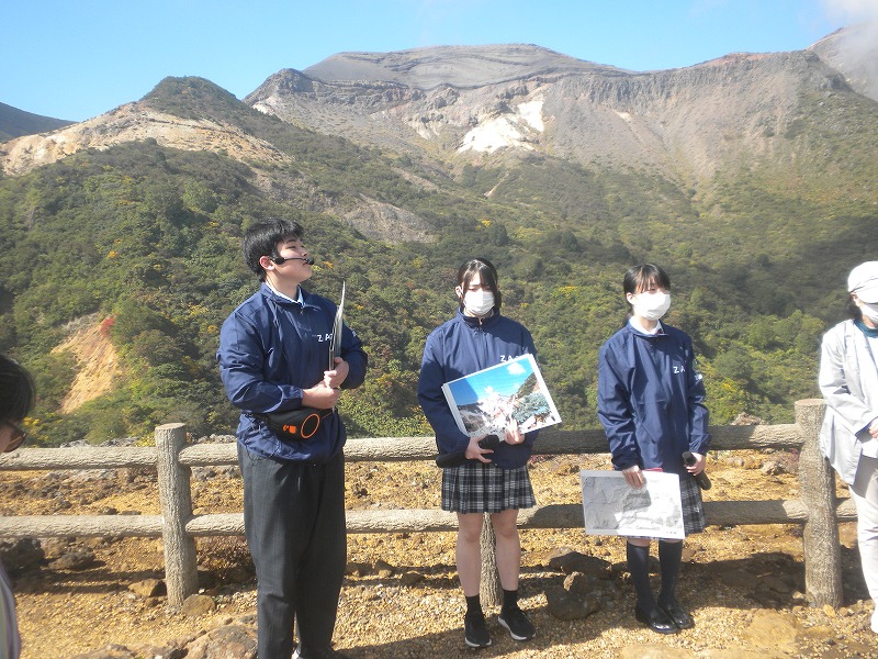 高校生のジオツアー 2025年10月4日今日は、蔵王高校の高校生によるジオツアーが行われ、参加してきました。これでこの行事にかかわるのは3年目でしたが、着実にステップアップしているように感じました。 今年のツアーは、定員25名。エコーラインをコマクサ平、刈田岳と登り、遠刈田温泉で刈田嶺神社にお参り、昼食休憩。その後七日原に行き、チーズ作りというように、内容もブラッシュアップされて、参加者を楽ませるものになっていました。 紅葉が始まり、エコーラインは、大黒天を越えたところで紅葉が盛りでした。幸い天候にも恵まれ、コマクサ平での発表を終え、山頂へ。エコーラインの料金所の渋滞もなく、時間通り山頂に着けました。 風もなく穏やかな天気。時折り御釜が姿を見せました。山頂では、御釜についてや奥宮と御山詣り、蔵王火山と人々の暮らしについての説明がありました。 ほぼ時間通り遠刈田温泉に下り、刈田嶺神社での説明の後、昼食休憩。この日の遠刈田温泉は、食事を取るいろいろなところが満員でした。秋の観光シーズンの始まりです。 午後、七日原のハートランドでチーズつくり。牛乳と酢で作るナチュラルチーズでしたが、あっけないほど簡単にできました。これまでヨーロッパの山を歩いて、山中にある夏の放牧場で、チーズを作っている場面に何度も出合いましたが、チーズは山の中で大掛かりな装置がなくてもできるものだと実感しました。 その後ございんホールに戻り終了。高校生たちの成長を感じた、なかなかいい一日となりました。