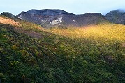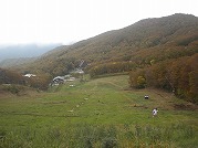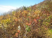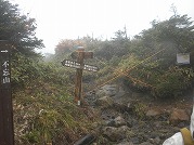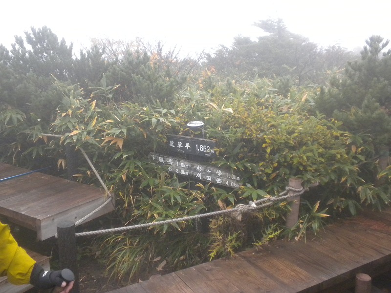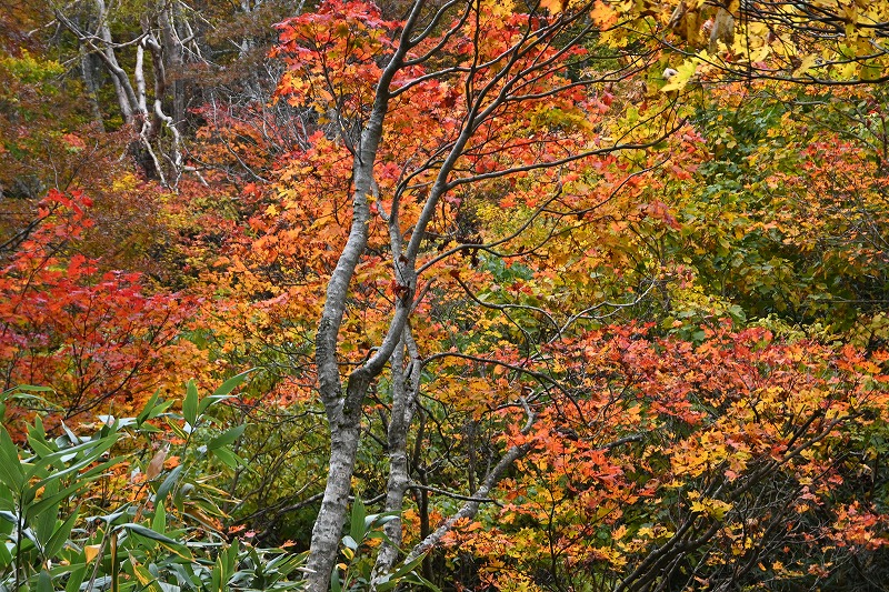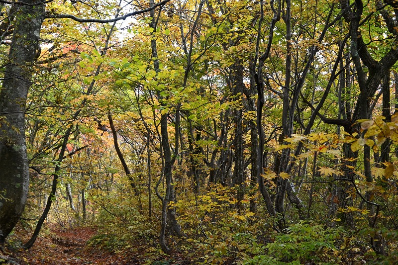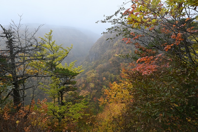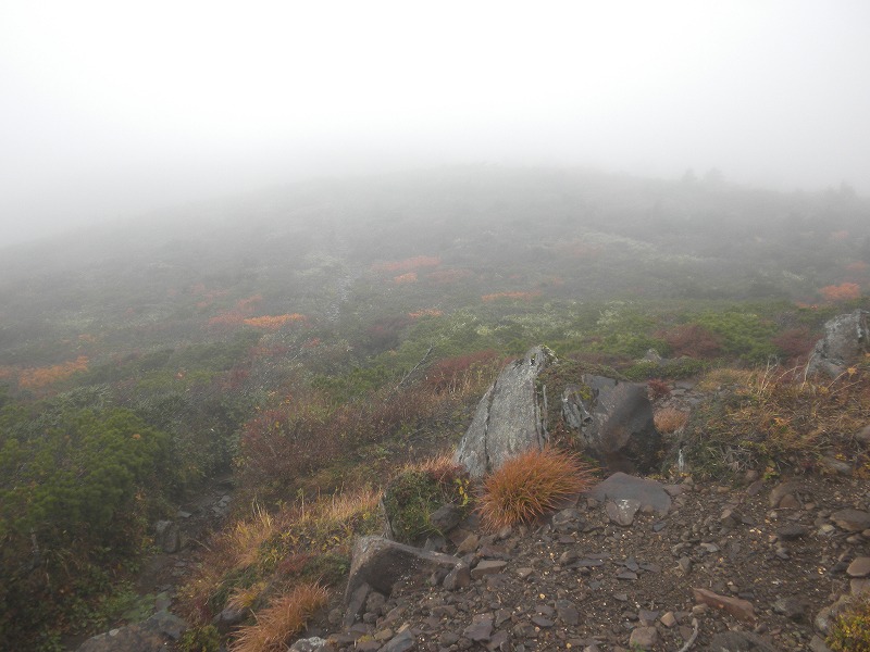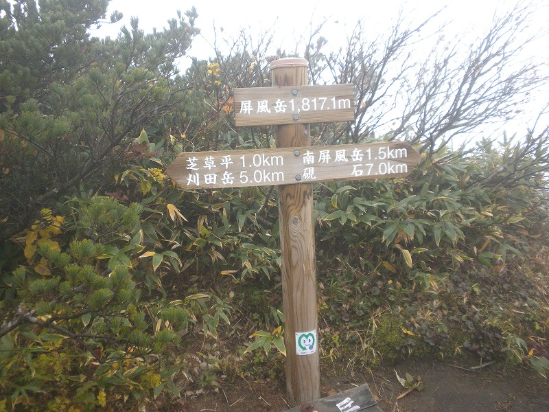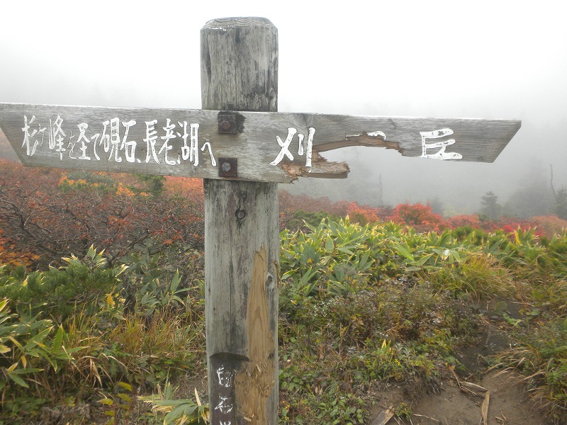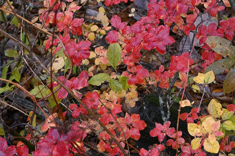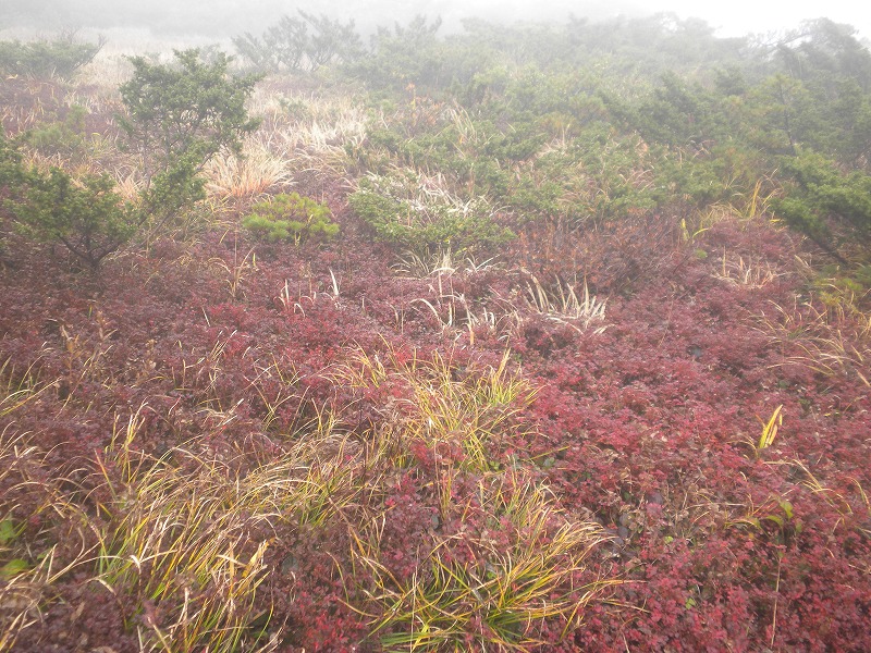 北屏風へ 2025年10月7日かよう会は紅葉を見ながら北屏風へとなりました。てんくらはAでしたが、稜線は終日雲の中。刈田峠駐車場には車なし。この天気を嫌ったものでしょう。登山道独占です。 登山道に入ると、ミネカエデの紅葉が目につきます。多くは黄色ですが中にはオレンジ色のものも。まれにヤマザクラの赤も見られます。縦走路脇には、ヒロハヘビノボラズの赤い実も。 霧の中(雲の中)を前山を過ぎ、杉ヶ峰へ登り、芝草平へ。花はほとんどありませんが、ミヤマアキノキリンソウ、アザミがありました。芝草平ではチングルマが紅葉。 1時間弱で北屏風山頂へ。ここで昼食。下関からの単独縦走者に会いました。下半身は濡れています。硯石から上ってきたようですが、途中藪で濡れたそうです。北屏風から先は刈払いされていなく、藪です。 12時過ぎに下山開始。途中の後烏帽子への登山道は閉鎖中でした。その後もずっと雲の中。6時間で往復を完了しました。