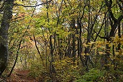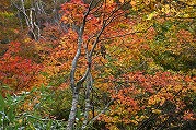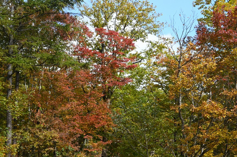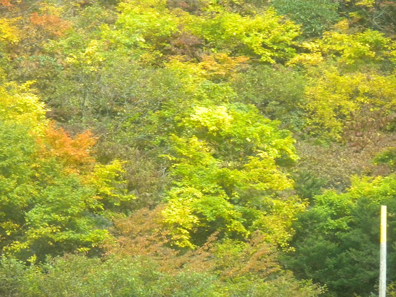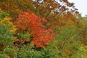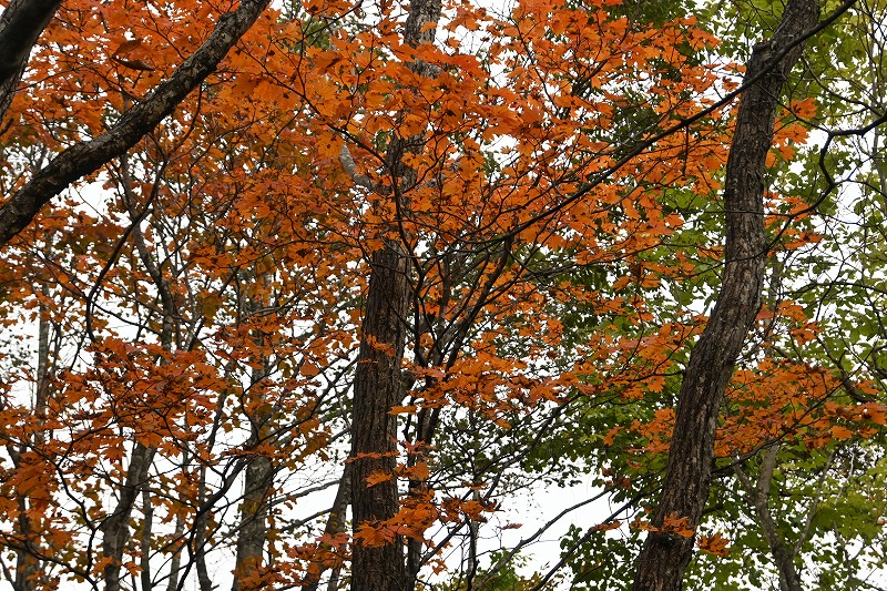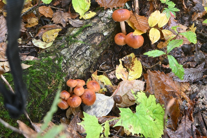 宮城蔵王の紅葉 2025年10月28日本日のかよう会は、宮城蔵王エコーラインの紅葉見物。前日のリサーチで、不動尊~スキー場が紅葉の見どころですので、すみかわスキー場から不動尊までの蔵王古道を下るルートを歩きました。 標高約1,000mのすみかわスキー場から、蔵王古道に入ります。落葉がたくさんで山道を埋め尽くします。一天名月は歩きにくいのでパス。巻道を下ります。 途中、オレンジの木々が。雲湧谷は霧がかかり幻想的でした。ここからウリハダカエデの赤色が目立ちます。色鮮やかな森の道です。途中キノコも出現。クリタケなどのほかあまり見かけぬスッポンダケなども初めて見ました。 不動尊に到着。不動滝は、紅葉に彩られていました。お不動さんの森も、紅葉の真っ最中。宮城蔵王の紅葉を堪能しました。その後下山、遠刈田公民館調理室で芋煮会でした。