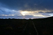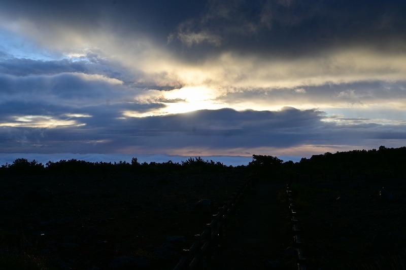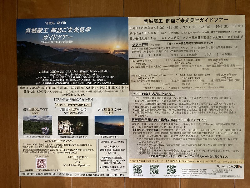 ご来迎見学ツアーと蔵王町カードツアー 2025年10月5日今日は大忙しでした。早朝、ご来迎見学ツアーのガイド、午前中に蔵王町カードツアーのガイドを頼まれ、午後は古道の会役員会と休む暇なく活動しました。 早朝のご来迎見学ツアーは、朝3時40分集合、4人のお客様を迎え、白衣裳を羽織り、刈田嶺神社里宮にご参拝しご祈祷。その後、刈田岳山頂駐車場までジャンボタクシーで登りました。対向車もなく料金所もスルーで予定より早く着きましたが、外は霧雨。車の中で5時過ぎまで待って、刈田岳へ登ります。西風に乗った霧雨が体を濡らします。山頂では薄明るくなりましたが、霧雨の中。何も見えません。奥宮にお参りし、崇高公命願の碑を拝み、少し早めに下山しました。せっかくのご来光と銘打っているので残念でしたが、コマクサ平で休憩。トイレに寄ると、東側が明るくなり、雲海が見下ろせます。雲の先が赤くなり、雲が切れました。 コマクサ平展望台に行くころ、東から日が差し、雲海の上に太陽が昇りました。五色岳の紅葉した山腹に日が当たります。不帰の滝周辺も紅葉し、なかなか見事なご来光を迎え、ほっとしました。車で下山後、遠刈田で解散。朝市をぶらぶらし家に戻りました。 9時前に、遠刈田公園へ。午前中は、古道の会の製鉄所跡草刈りと重なってしまいましたので、燃料を置いてきました。 その後ございんホールへ。蔵王町カードツアーの出発です。第3回となる今回は「信仰」がテーマで、呼ばれて蔵王古道を解説することになりました。まず向かったのが刈田嶺神社里宮。今日2度目です。宮司さんはおらず、本殿を開けていただき、敬明講図の実物を見ました。さすがに歴史の色をまとっていますが、看板より迫力があります。 刈田嶺神社の説明の後、澄川濁川合流点へ。濁川の方の岩石は、薄く何かが付着しています。火山に由来する成分です。澄川の方は石はきれいです。これだけ見ても違いが判ります。合流点を見学した後、取水塔近くで、この水の行方を解説。大正期に作られたトンネルを通り、秋山沢川へ。その後トンネルを通り、遠刈田発電所へ行き、発電します。この発電量は遠刈田地区をまかなう量だそうです。その後、曲竹発電所に送るものと、松川の底をサイフォンを使い、反対側の疣岩分水工を経て、澄川用水・黒沢尻用水となり700ha以上の耕地を潤します。これらが100年以上動いているのです。 次は蔵王の名物リンゴ「蔵王はるか」のシャーベットをいただき、東急別荘地にある、澄川の崖を見学。ここはちょうど七日原の扇状地を澄川が侵食した位置にあり、扇状地の断面が見える崖です。 さらに、冷泉堂。古道にある水源です。現在も遠刈田の水道に使われています。ここでも、地質に起因する湧水とそれが御山詣りに使われたことを話しました。 最後に向かったのが、カナガラ仏。カナガラの意味とこの場所の歴史的役割。女人禁制の最終地であったこと。仙台二中の遭難、賽ノ磧の入口でこの先三途の川・不帰の滝という死後の世界の始まりと、山頂・浄土平での復活という蔵王御山詣りの信仰「生まれ変わり」について話しました。 なかなか行けない場所を廻ったツアーでしたが。面白いツアーコースでした。