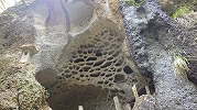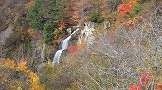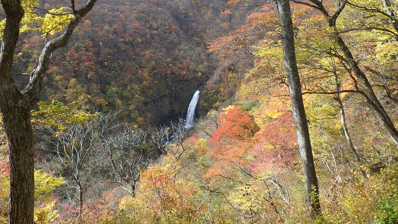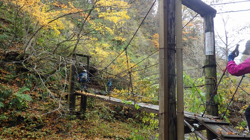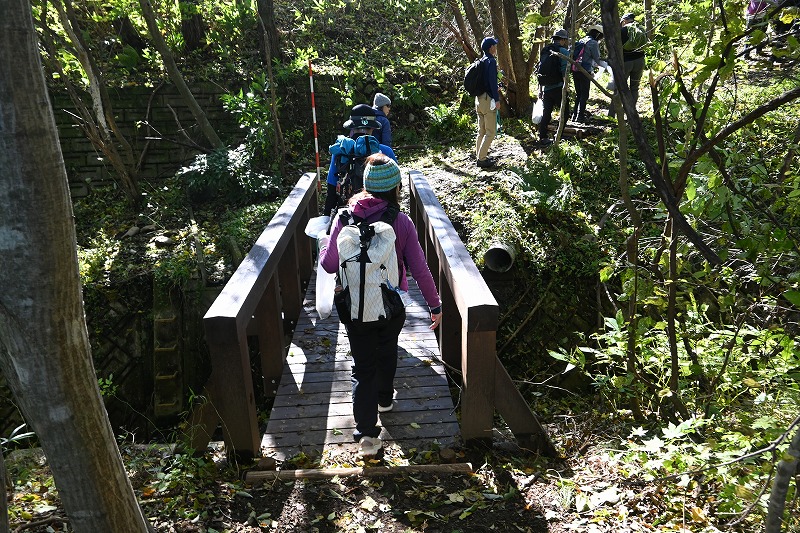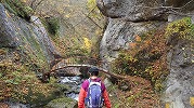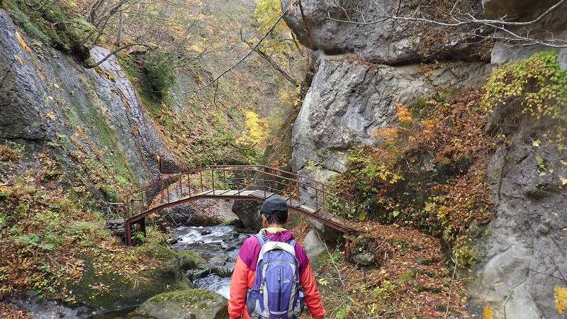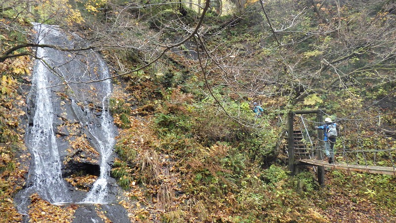 紅葉川渓谷と垂水遺跡 2025年11月11日今日のかよう会は、山形遠征。仙台駅から仙山線でスタート。山形県に入って面白山高原駅で下車。ここが、紅葉川渓谷歩きのはじまりです。 紅葉川に沿って渓谷につけられた道を下ります。周りは紅葉。幾つもの滝や奇岩を見ながら、吊橋を7回ほど渡り、岩につけられた道をたどるコースです。英文のパンフレットには、Momijigawa River Gorge,つまり紅葉川峡谷と書かれています。文字通り急な崖に挟まれた狭く深い谷です。前日の雨で落葉が濡れ、気の抜けないコースが続きます。 最後に、線路下のトンネルを抜け林道へ到着。1時間40分ほどかかりました。山寺まで5.8㎞と書かれています。 林道の途中から川に下り、鉄道と並行する道を歩きます。山寺近くになりあるのが山寺千手院歴史の道。垂水遺跡などがあります。「峰の浦やまでら天台の道」と書かれています。ここは、凝灰岩がくりぬかれた山伏の修業の場だったようです。ハチの巣状の穴が開いていますがその成因は?白岩七岩という奇岩もあります。 一通りめぐって、山寺の参道に出ます。ここで昼食。山形芋煮蕎麦をいただきました。その後15時28分発の電車に乗車。帰りは作並から車で送っていただき、17時過ぎに帰宅しました。