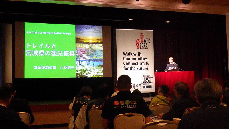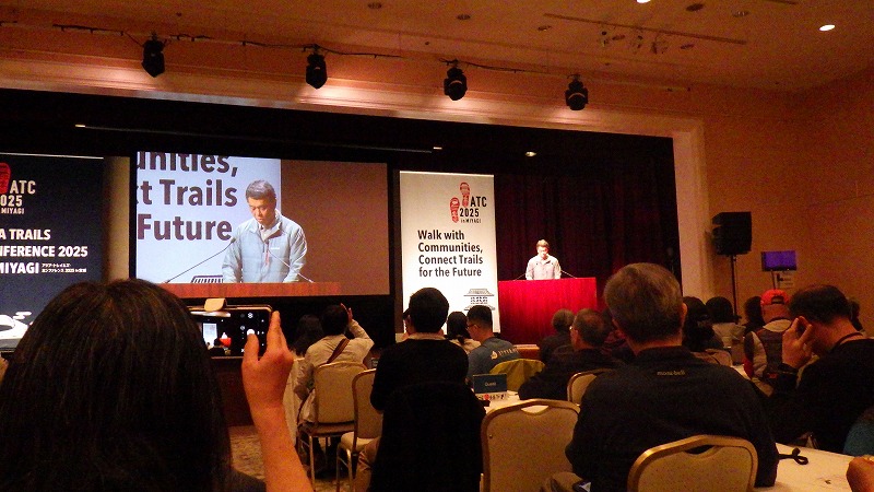 アジアトレイルカンファレンス 2025年11月14日この日、表記の集会があり、参加してきました。トレイルにかかわる方々の集まりです。遠刈田温泉と多賀城のオルレコースの開設に合わせて、宮城県が主催したもの。遠刈田温泉のホテルメルキュールで開催されました。 アジアトレイルカンファレンス(ATC)ということで外国からも参加していました。宮城県知事、蔵王町長などの挨拶の後、書道家のパフォーマンス。辰野勇モンベル会長の基調講演。それに続いて昼食。おにぎりと豚汁が出ました。 午後は、各国のトレイル団体の報告、パネルディスカッション、アメリカと南アメリカのトレイル団体の災害にかかわる報告、オーストラリアのトレイルと観光の講演。それに続いて、宮城県副知事の小林徳光氏による講演。この中で蔵王古道について触れていただきました。 長い一日でありましたが、いろいろ学び考えることがありました。そしてたくさんの記念品をいただきました。
