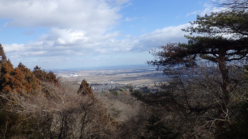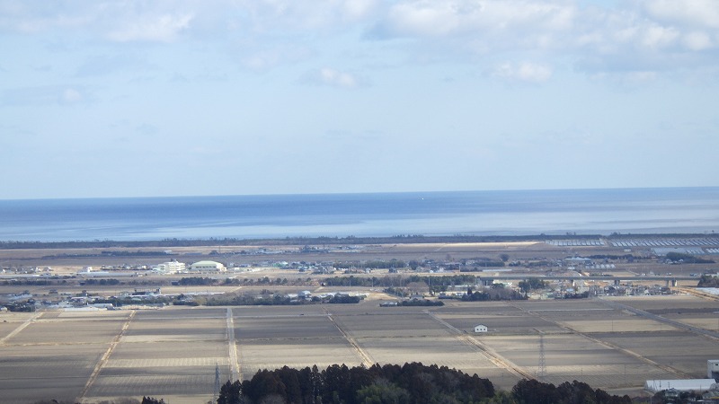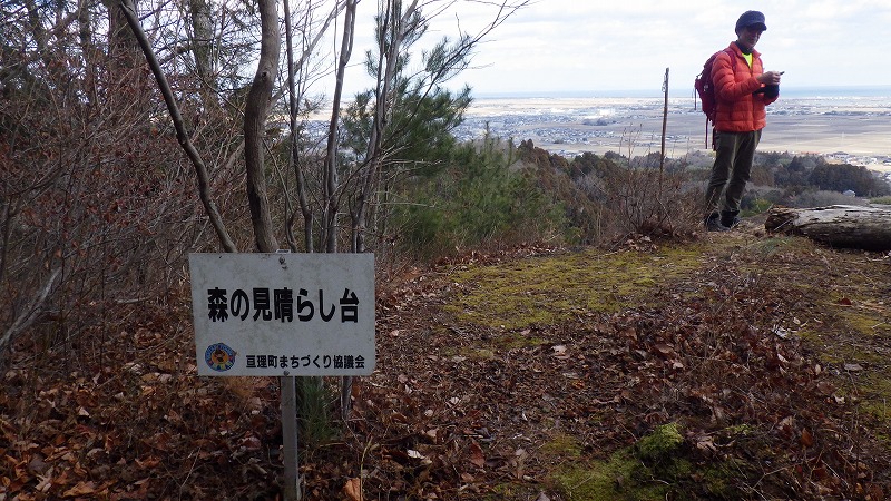 黒森山を過ぎ、小一時間で夜討峠に着きました。11時半ですが、早めの昼食をということで、展望台まで降り、昼食。牡鹿半島の見える太平洋を望み見ながら昼食。