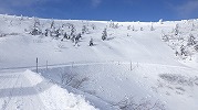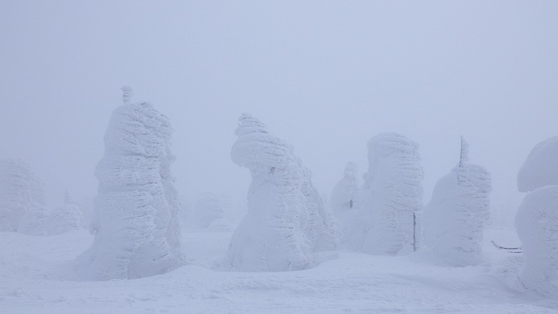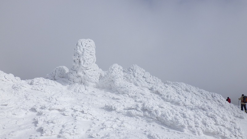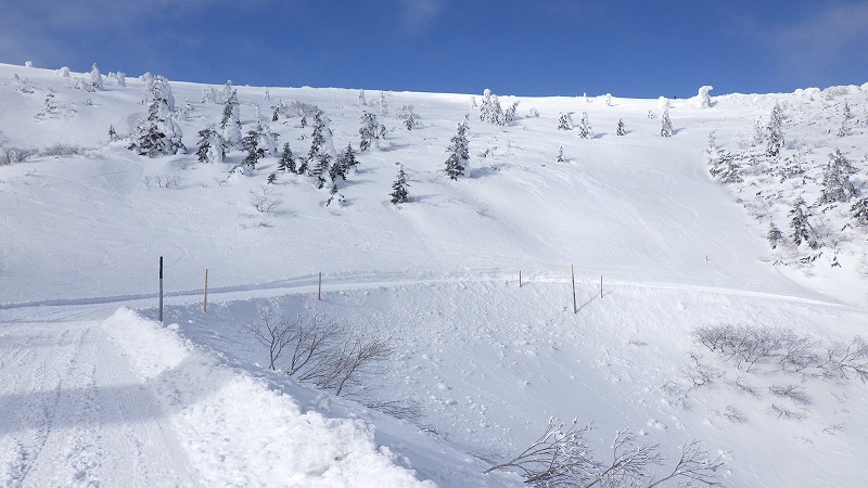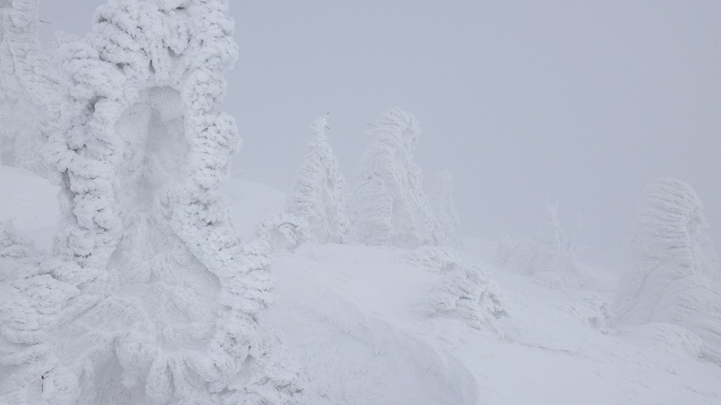 風はなく、山頂での昼食時間。初めてのことです。帰途は、せっかく来たので樹氷原経由で。このころ少し雲がかかりましたが、幻想的な樹氷原を歩きながら、エコーライン・中央コースを経て、3時半にすみかわスキー場に戻りました。