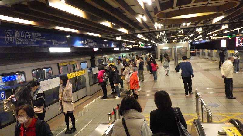 台北のMRTはシステマチックによくできています。それぞれ漢語で路線名があるのですが、それを色に置き換え、駅には色の名と数字で別名がつけられています。例えばG13とかR9のようにです。ただ困るのは、終点の名が漢字なので、行き先を見ないと上り下りがわからないことです。