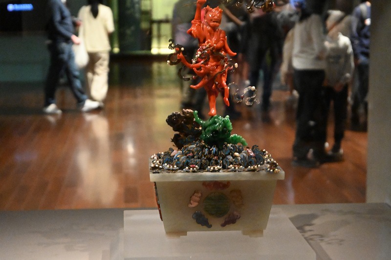 建物は、中国の宮殿を模したもののようです。入園料一人350元、日本円で1750円くらい。それでも、中国の至宝が満載のこの博物館に入場する価値のがありそうです。 最初に見たのは3階の302.残念なことに肉形石と翠玉白菜は展示されていませんでしたが、小型の白菜は見ることができました。玉を組み合わせてこのような工作物を作ったのはなぜ?と言わんばかりの美しさです。