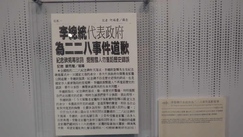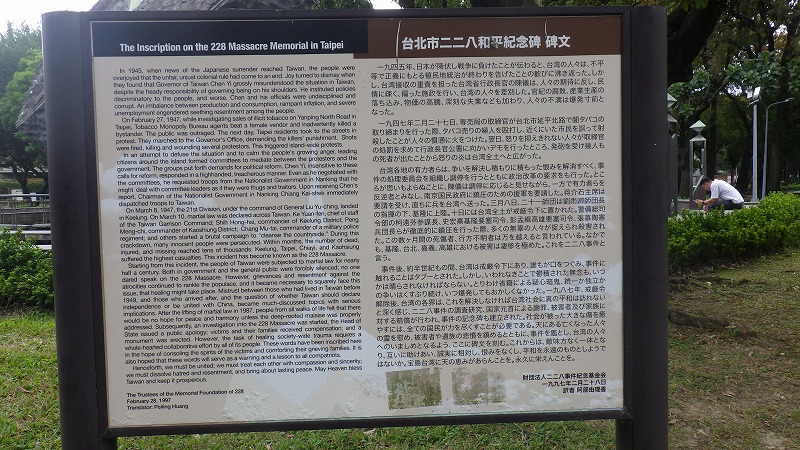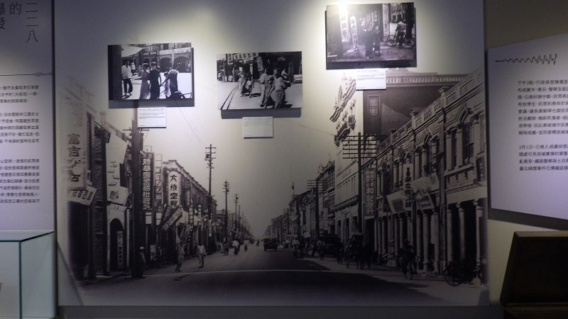 公園の南側に、228記念館があります。228事件は、こちらに来て初めて知ったのですが、終戦後の1947年に起きた事件です。台湾の政治がうまくいっていなかった時代の事件でその後長きにわたり台湾の社会に影を落としたようです。1995年に台湾総督の公式謝罪が行われましたが、人々の対立など深い影響を及ぼしたそうです。記念館では犠牲者を悼み、映像や音声でその声が聴けるようになっています。なお、宿の近くの道路がこの事件の発端となったようです。