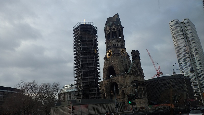 ここから、100番のバスで、ツォー駅へ。これと200番のバスで、ベルリン中心部を横断した形になります。途中、戦勝記念塔ジーゲスゾイデのある広場を経て、ツォー駅へ。ここは、東西に分断されていたころの西側の中心駅だったところで、にぎやかです。ここにある、カイザーウイルヘルム教会は、戦争の惨禍を忘れない、と修復されずにいます。隣には、新しい四角い箱の教会があり、青のステンドグラスとオルガンが美しい。ちょうどオルガンの演奏をやっていました。またその反対側には、細長い塔を建設中でした。