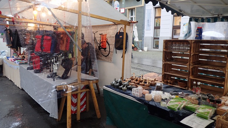 コルヴィッツ通りにでると、道を仕切って市がたっていました。食料品や日用品を売る店がずらり。ちょうど土曜日なので行き会わせました。