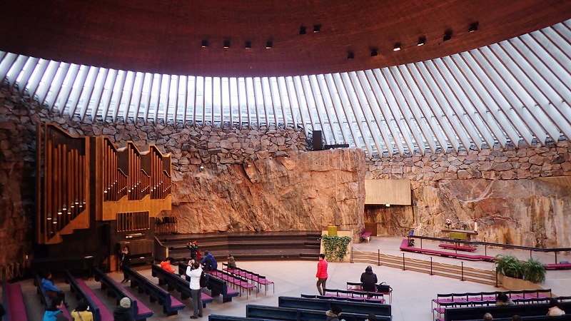 岩の教会:テンペリアウキオ教会は別名「ロックチャーチ」と呼ばれる岩の教会です。ここは前にも来たことがあるのですが、そのデザインの斬新さに驚きます。が、教会という祈りの場の雰囲気は保っているのです。