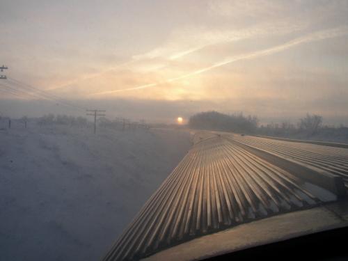 早く寝たせいか、夜中の2時ころ目が覚め本を読んで時間を過ごしまた眠ってしまった。次に起きると8時。何もしないのに何だか疲れが残っている。朝食に行く。今日はガラアキ。「エッグスベネディクト」という今日のスペシャル料理を食べる。小判型のパンケーキの上にハムと温泉卵が乗っかったものが2つついている。結構おいしい。コーヒーを飲んだ後、展望車へ。ガラアキ。先頭の席でしばし風景を楽しむ。地吹雪のような状態。正面左より日が昇ってくる。東に向かって進んでいるというのを実感する。地形は相変わらず平らな雪の大地。小さな林、時々人家、左側に電線という、昨日から変わらない風景が続いている。食堂車のマネージャーが来て、昼食の時間を変えるという。ウィニペグ着が昼食と重なるからだ。デジカメの電池がアウト!電気かみそりとライトの電池でとりあえず使える。買わなくては。