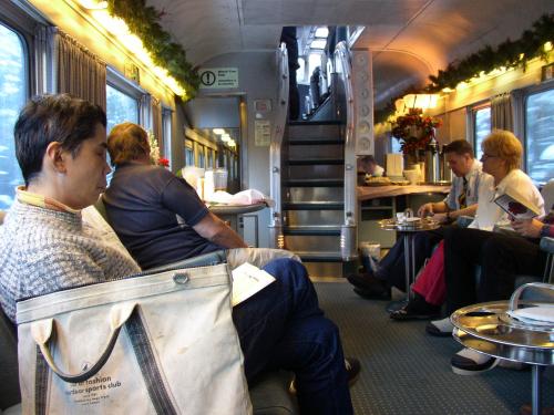 動き出してから、客室係が「夕食の予約をしたか」というので食堂車に行くと、「9時に来い」。昼を食べていないので長かったその間にシャワーを浴びてさっぱりする。お湯がドンドン出る。快適だ。結局、夕食は10時スタート。近くの2段寝台の2人とアメリカから来た白人青年の4人でテーブルにつく。さすがにしっかりとしたディナーでしいたけと鶏肉のスープ、パン、テンダーロインステーキとたっぷりの野菜、コーヒー、ケーキ(甘くて大きい)というちゃんとしたコース料理だ。食事が10回分乗車料金に含まれている。日本のレストランで食べると、いくらかかることやら。が、とにかく遅い。1時間あまりで最後のデザートまで行き、11時過ぎに終わった。座席に戻るとベッドがセットされていた。2階に登り、ワインを少し飲んで寝た。
