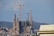 続いて、少し先に行くと、カタルーニャ庁舎と市役所、さらに、カテドラルがあります。巨大な聖堂の中を見た後、屋上に上れます。エレベータに乗ると、屋根の上に置かれた通路を通り大聖堂からのバルセロナの景色が眺められます。海のほうには我々の船がコロンブスの塔の隣に見え、またサグラダファミリア教会も間近です。