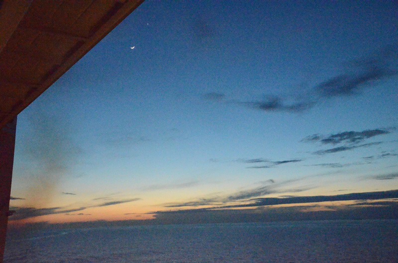 船は、1時半最終乗船。昼食をとっている2時に出港し、次の寄港地、イタリアのチヴィタベッキアに向け850海里の航海に出発しました。明日は、終日航海。夕方、三日月と金星が西の空に見えていました。