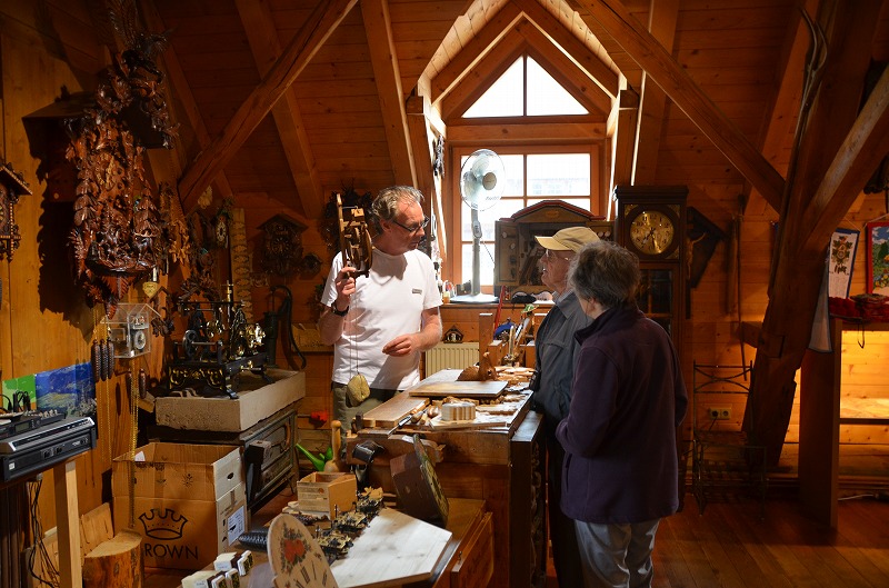この地の名産品は、鳩時計。昔から木工品の加工が盛んで、その中で、鳩時計が作られ名物になったようです。工房で、実演が行われていました。