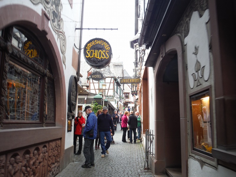 その後、船に戻り昼食。船はリューデスハイムで停泊。ここは、ライン川のワインづくりの中心として有名な町で、町中には、ドロッセルガッセ(ツグミ横町)という名のワイン酒場の並ぶ通りを中心に賑わっていました。この夜は、ここで停泊。