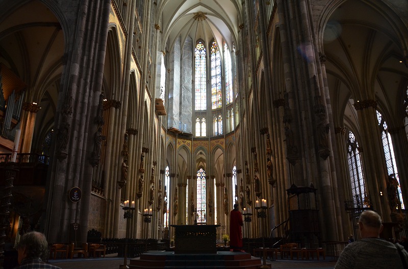 ケルン大聖堂は、高さ157mのゴシック様式教会で、ヨーロッパ北部で最大の教会で、霞ヶ関ビルより高いそうです。1248年に着工、完成まで600年もかかったとのことで、第2次大戦でも被害を免れたそうです。ドイツ第一の観光地とのことでした。外観もさることながら、中に入ると、黄金の棺やステンドグラスなどすごい迫力。