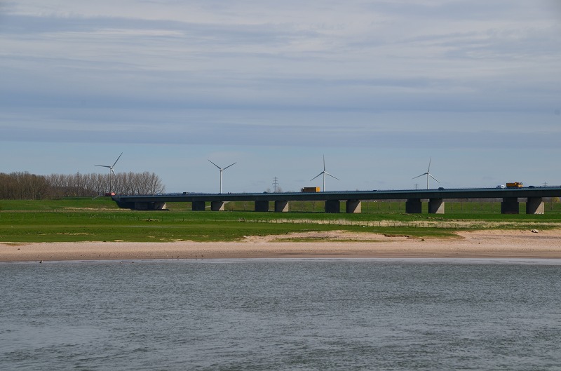 船は、ドイツを過ぎ、オランダへと入りました。海までもうすぐです。発電用の風車が並んでいます。ロッテルダム近くのキンデルダイクは、かつて使われていた風車がまとまって残されており、世界遺産になっています。