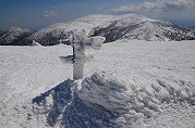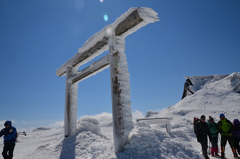 暦も4月に入りました。関東では桜満開、ということですが、こちらではもう少し時間がかかりそうです。 春の移動性高気圧に覆われた4月1日、刈田岳に登ってきました。2月に行って以来、2度目ですが、今回は、地元の登山愛好グループの方々と一緒です。13人のパーティーですが、この中には、宮城蔵王ガイド協会のメンバーが4人も参加しています。 すみかわスノーパークのリフトを使って登り始めた10時頃は、まだ昨日からの強風が残っていて、ガイドの方の言では、風速15mとのこと、樹林帯を抜けると、まともに風を受けながらの登山でした。 途中、エコーラインの除雪作業の現場に出会いました。4台の重機で除雪しています。今月25日開通に合わせての作業ですが、2月の豪雪の名残で、雪の壁の高いこと。このあたりでも、5m近くあります。道路はすっかり埋まっているので、路肩にマークをつけての作業です。 屏風岳の方には、山形側からの強風で、雲が飛んでいます。高度を増すにつれて、雪は表面が薄く凍った状態になっています。 たどり着いた刈田岳避難小屋はすっぽり雪に覆われ、風下側の入口がかろうじて、空いています。風上側はエビのしっぽに覆われて、まるで大きな岩のように見えます。小屋の中で昼食を取り、出発。 山頂の刈田嶺神社は、屋根の部分が見えていて、2月には、雪の固まりのようだった鳥居も姿を見せています。熊野岳に続く稜線もくっきり晴れて、熊野岳避難小屋や山頂も見えています。お釜は、そこの部分が氷になって、2月には雪原であったのが、何となくそれらしく見えます。頂上直下のレストハウスの向こうには、遠くに、朝日連峰の姿も見えています。道標も、エビのしっぽに覆われています。 下山する時には、風は収まり、春山のいい天気になりました。除雪作業も、今日の分だけ前進し大黒天まで進んでいます。 スキー場に出て、ベトベトの雪の上を下って、スノーパークに着き、遠刈田に戻ったのは3時でした。