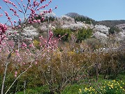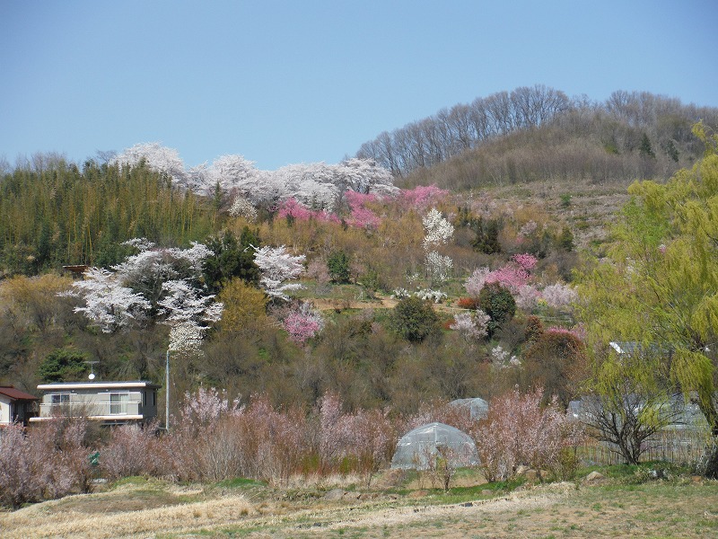 埼玉から戻る途中、満開の福島の花見山に立ち寄りました。 福島駅で、往復500円のバス切符を売っており、臨時バスが出ていました。10数分で、バスの終点。たくさん人が出ています。バスを降りると、一方通行の道を通り、公園入口へ。10分くらいですが、途中、花、花、花。淡い色の桜、深い色の桜、桃の濃い色もくっきり。黄色はレンギョウ、菜の花、サンシュユ、ロウバイ。辛夷、モクレンの白。赤の木瓜、デショウジョウ、椿。そして、若葉の薄黄緑。 60分コースとやらを辿ると、花見山の展望台に。ここからは、福島の町の向こうに、雪をかぶった吾妻連峰が見えています。午後でしたので、少し霞んでいましたが、青空の下、白い山々が花の向こうに見える様は素晴らしい。 写真家秋山庄太郎氏が、「桃源郷」と喩えたと書いていましたが、まさに「桃源郷」。どこを撮っても、鮮やかな色合いの写真になるのです。 この景色が、自然のものではなく、この地の農家の方々により作られたというのもまた素晴らしい。 満開の花を満喫して来ました。