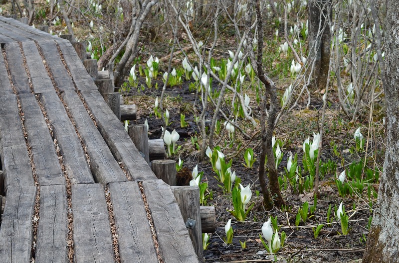 我が家から約9kmのところに、「水芭蕉の森・どうだんの森」というのがあります。白石市に属しています。 ここの水芭蕉が、そろそろ見頃だというので、出かけてきました。車で10分少しです。 途中、狭いながらも鋪装道路が続き、広い鋪装された駐車場があります。林の向こうは、南蔵王の連峰です。駐車場には、まだ雪が残っています。 10分も歩くと、水芭蕉の森・どうだんの森の分岐点。ここから、木道が始まります。水芭蕉は、ちょうど咲き始めです。木道の回りに、たくさんの花が咲いています。山際には残雪。ここは、国立花山青少年自然の家・南蔵王野営場の隣で、野営場へ行く道もあります。 木道が終わり、広場に行く途中に、カタクリの群落を見つけました。周りには、ブナの木も多く、ウッドチップが敷かれた道には、ブナの実も落ちています。 少し奥には、「どうだんの森」があり、花の咲く6月や紅葉の時期には、楽しそうです。 ただ、ここは、「ツキノワグマの生息域」なんだそうで、熊には注意です。もう冬眠からさめたのかな?