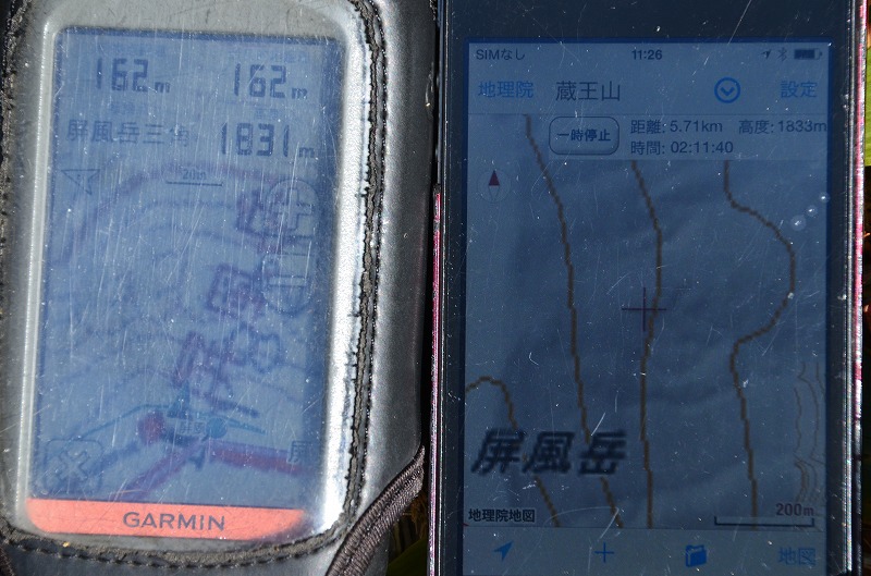 秋晴れが続いています。今日は、昨日見た屏風岳からの紅葉と芝草平の様子を見に行きました。 刈田峠の駐車場は、平日なのに結構埋まっています。9時半スタート。ススキが出て、秋らしい景色です。 登山道の入口には、「除草中 登山道」の標識が。進んでいくと、宮城蔵王ガイド協会の方々が、登山道の刈り払いをして下さっています。 芝草平は、草紅葉を過ぎて、冬の始まりの風情です。野イチゴの実がありました。葉は枯れています。ナナカマドも、葉を落として、実が鮮やか。これくらいの標高では、紅葉は終わり、冬の準備中、と言ったところ。 屏風岳に登り、「宮城県最高地点」には、「地理院地図」では、1825mの標高点が書かれていますが、2台持っていったGPSでは、1830mを越えています。Garminでは1831m、iPhoneでは1833mです。 屏風岳三角点付近から、西側の烏帽子岳、水引入道の間に見えるのは、秋山沢の上流ですが、見事な紅葉です。 昨日は、後烏帽子の右に見える、前烏帽子からの紅葉でしたが、こちらから秋山沢を見下ろすと、烏帽子から水引入道まで紅葉が広がっています。 帰りに、芝草平を通るときに、おびただしい数の小鳥の群れが北から南へ飛んでいきました。一瞬のことで、何という鳥かわかりませんが、南へ渡りを始めているようです。 山形側の山腹も、色鮮やかな紅葉が見えました。秋も盛り、少しずつ、季節は冬へ移っていきます。