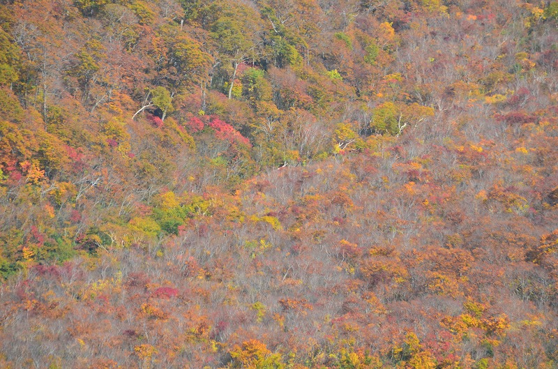 紅葉が進んでいます。 昼間、エコーラインで、賽ノ磧まで登ってみました。ここでは、紅葉はそろそろおしまいの時期。 腹が白いホシガラスがせっせとハイマツを渡り、エサを食べていました。このあたりには、何羽もホシガラスがいます。木から木へと移り、開いた松ぼっくりの、奥の方にある、松の実を食べています。 紅葉は、今、澄川スノーパークのあたりから、不動尊、滝見台あたりが盛りです。高気圧に覆われた好天気のもとで、たくさんの車がエコーラインを上っていました。