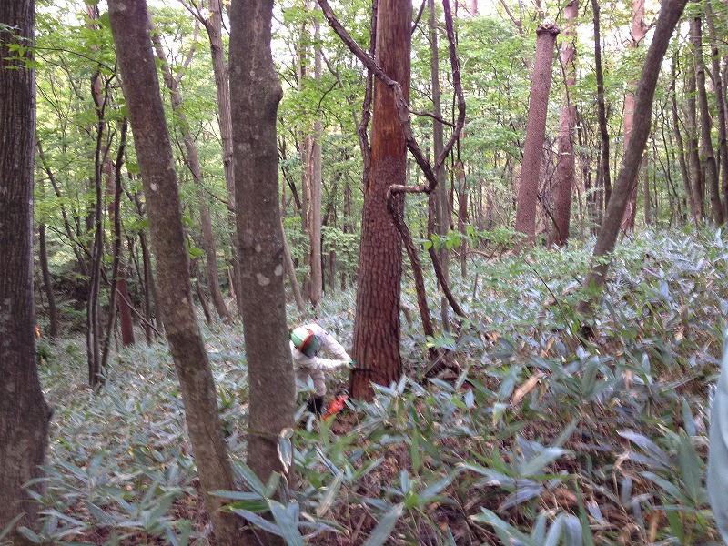 野鳥の森の森林整備活動のお手伝いをしました。 林内には、枯れてしまった木もたくさんあります。そのままにしておくと、遊歩道に倒れてくる危険がある枯れ木を伐採する作業です。 遊歩道のそばにある大きな枯れた赤松を伐採します。チェーンソーで切り倒すのですが、周りに木がたくさんあるので、それを考慮しながら、倒す方向を定めなくてはなりません。 直径が50cmを越えるとなかなか大変です。それでも、チェーンソーという道具があるので、何とか切れますが、これがなかった時代には、斧で切るか大鋸で切るか、いずれにしても大変な作業だったと思います。