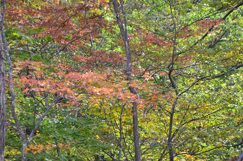 標高300m付近の我が家の周りでも、紅葉が進んでいます。 ヤマモミジの木も色づき始め、この春植えたブルーベリーの葉も赤くなりました。 近所を散歩すると、松川の中州はススキが見られ、土手の桜も色づいてきました。また、近所の別荘地の中でも、ドウダンツツジや桜が色づいています。 我が家の奥の林も、賑やかになってきました。