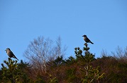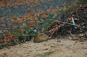 庭に見慣れぬ鳥が飛んできました。 地面に落ちていた、コナラのドングリを咥え、食べました。しばらく、歩き回っていましたが、そのうち、色づいた紅葉の枝に飛び移り、飛んで行ってしまいました。 この鳥の名は、カラスの仲間の「カケス」でした。