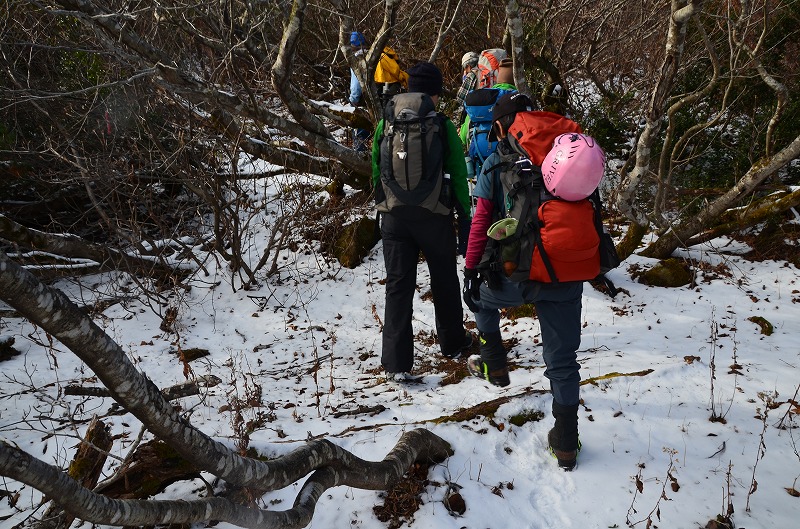 11月4日〜5日にかけて、「蔵王古道フルコース」というイベントが行われました。 この9月、復活した蔵王古道の道づくりを行った「かよう会」の催し。11月4日に、遠刈田の刈田嶺神社を出発。その日は、中間の蔵王高原ホテルに泊。夜は「山下ろし」の宴。翌11月5日、刈田岳まで歩き、下りてくる、という企画です。 蔵王連峰の山々は、先月末の降雪で、白くなっています。麓の遠刈田は今紅葉の盛り。紅葉から新雪の山を楽しもうという企画です。 11月4日、10時に刈田嶺神社(里宮)を出発。ご神体は、先月山を下り、今こちらにいるそうです。折しも、蔵王エコーラインは、この4日の夕方から来年の春まで、澄川スキー場から上山の坊平スキー場まで通行止めになります。 遠刈田の町は、紅葉の真っ盛り。滝見台付近まで、紅葉が楽しめます。道の両側は、紅葉の赤とオレンジが見事です。古道の入口につけた、お参りの木札も健在です。 不動滝あたりから、木々の葉は散ってしまい、冬景色。遠刈田から5時間で、今日の宿泊先「蔵王高原ホテル」に着きます。この先が、通行止めになるのです。浴室からの雄大な眺めを見ながら一風呂浴びた後、夕刻から宴。 翌日は、朝の太平洋から昇る朝日を期待しましたが、残念ながら、雲が発生して、見ることができませんでした。朝食後出発。エコーラインのゲートは閉まっています。来年の春、4月末までの半年間の眠りにつきます。 古道を歩けば、道の両側には、霜が降り、霜柱がずっしり。初冬のおもむきです。水があるところには、氷が張っています。 賽ノ磧まで行くと、ホシガラスが積雪前の最後の時期を忙しそうにしています。所々に雪が見え始め、刈田岳・五色岳・熊野岳と続く稜線は白く化粧しています。 大黒天近くでは、道が真っ白になっているところも。左に見える屏風岳は、霧氷に覆われた木々が見えます。 大黒天を過ぎ、刈田岳への最後の急登にさしかかると、ハイマツにはエビのシッポが付き、いよいよ冬の様相です。 山頂直下の避難小屋は、夏の入口を閉鎖し、冬の出入り口のみの冬支度。中に入ると、このたび配置された、ヘルメット、水、毛布などが置かれています。 刈田岳山頂は、真っ白。エビのシッポがあらゆるものに付き始めています。高気圧に覆われた、風もない晴天の元で、山頂まで登ることができました。 帰りは、高原ホテルまで降り、その後、所用のため、車で遠刈田に戻りましたが、とても楽しい初冬の山行を楽しめました。