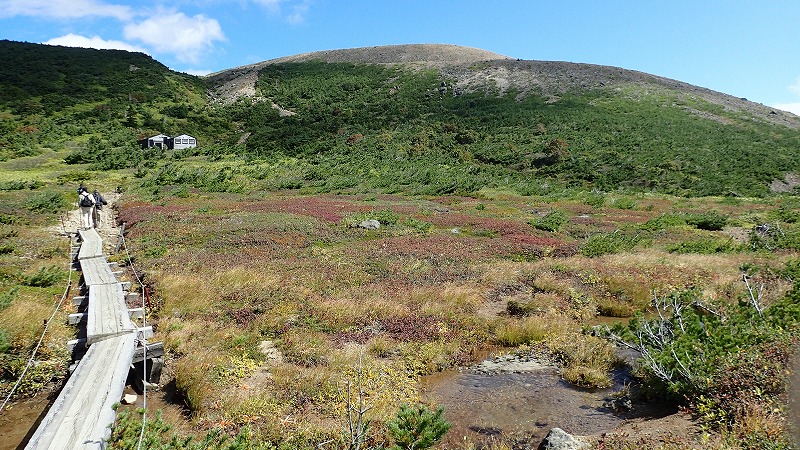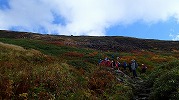 屏風岳の紅葉 2017年9月26日高気圧に覆われ、好天が続きます。この日は、かよう会の皆さんと、屏風岳の紅葉を見に行きました。さわやかな気候です。 エコーラインのコマクサ平では、刈田岳・五色岳・熊野岳・ロバの耳岩が見えています。刈田峠の駐車場は平日とあって、空きがありました。週末は早く来ないとだめだろうな。 これから向かう南蔵王方面もくっきり。登山口では、蔵王町の宮小学校の5年生が登山開始です。前山を越え、杉ヶ峰を越え、芝草平を過ぎて、屏風の登りになります。後烏帽子の分岐点で休んでいると、ヘリコプターが・・・。何度も上空を飛んでいます。写真に撮り後で調べてみると、JA62NHの機体番号は、民間のANA系列のヘリでした。夜、NHKのニュースを見ていると、屏風岳の紅葉が放映されていましたが、その撮影でした。登山道を行く小学生の姿も一瞬出ていました。 屏風岳からは、水引入道と馬ノ神岳の紅葉が見事。昼食ののち下山にかかります。 行きは素通りした芝草平で一休み。池塘はすっかり草紅葉。背景の屏風岳の紅葉と相まって素敵な景色です。チングルマの赤が印象的でした。