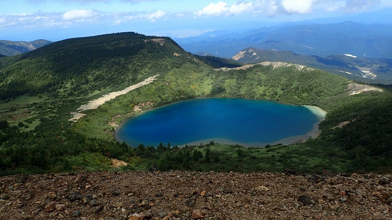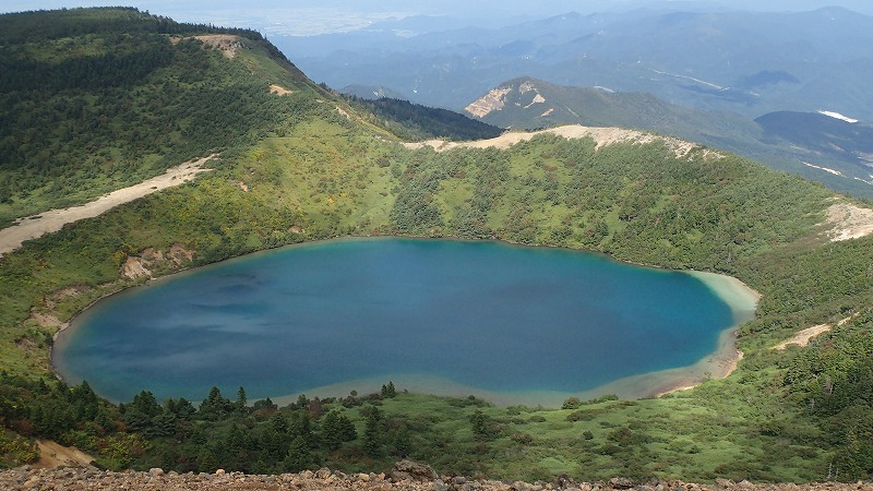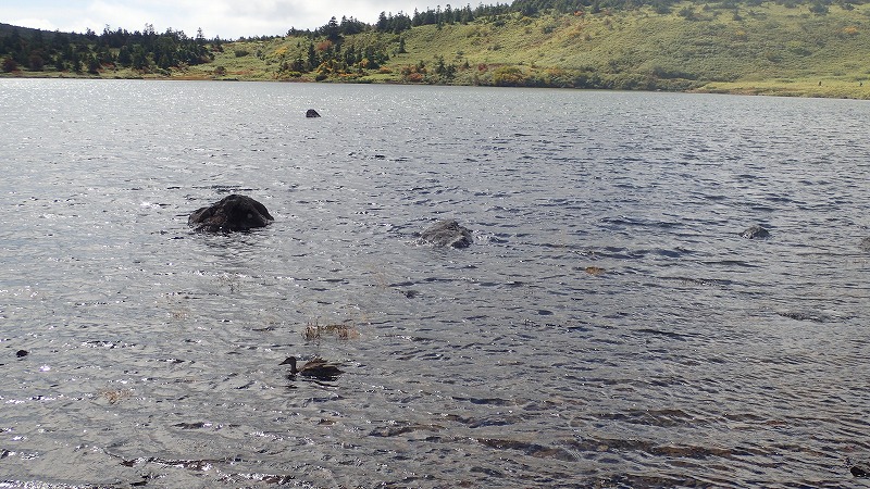 魔女の瞳に逢いに行く:一切経山 2017年9月19日台風一過の好天を利用して、かよう会の皆さんと福島県の吾妻連峰にある一切経山に行きました。この山の魅力は何といっても魔女の瞳(吾妻の瞳)と呼ばれる、五色沼の景色です。 遠刈田を7時に出発、東北道経由で福島飯坂ICで降り、スカイラインへ。この道は、途中、高湯温泉を経由して標高1600mの浄土平に向かいます。途中、吾妻小富士の端正な姿が印象的。 浄土平は吾妻小富士、一切経山、東吾妻山などに囲まれた湿原で、レストハウス、天文台、ビジターセンターがあります。青空の下、これから登る一切経山が荒々しい姿を見せています。まずビジターセンターに寄り、見学。その後登山口へ。しばらく湿原を歩いた後、登り道にさしかかり、小一時間で酸ヶ平の湿原。ここで右に道を取り、酸ヶ平避難小屋でしばし休憩。この小屋は、トイレのついた立派な避難小屋です。 いよいよ一切経山の登り。ゆったりした登山道を登っていきます。途中、背後に鎌沼が見えてきます。さらに登ると右手に吾妻小富士が見えてきます。 40分ほどで山頂。さらに北に行くと、眼下に魔女の瞳こと五色沼が見えます。青~紺の美しい色をしています。日の当たり方により微妙に色が変わります。一切経山には、一等三角点が置かれています。山頂の標識とともに大きなケルンが積まれています。また、家形山から続く吾妻連峰の主稜線が東大巓、中大巓、西吾妻山まで見えています。台風の余波のせいか、風も吹いています。 山頂で展望を楽しんだ後、下山開始。吾妻小富士や鎌沼の景色を見ながら降り、避難小屋へ。そして、酸ヶ平と鎌沼を進みます。沼のほとりで昼食。鴨が数羽います。人から餌をもらう習慣ができているようで、寄ってきます。食事のあと、鎌沼を回ります。ここでは、紅葉が進んでいて赤や黄色が緑のササを背景に印象的。リンドウも咲いています。途中寄り道をして姥ケ原の姥神石像を見に行きました。恐ろしい形相です。 また沼のほとりの道に引き返し、木道を浄土平に向かって戻っていきます。木道の架け替えをしていました。まだ立派な部分もありますがそれでもメンテナンスしています。ヘリコプターで資材を下し、架け替えた材木もヘリで回収するようです。さすが、国立公園だ、と南蔵王の木道を思い出し、うらやましくなりました。 浄土平に戻り、吾妻小富士の火口壁まで登ってみました。一周するには時間がないので、今回はここで終わり。帰りに、高湯温泉の共同浴場により、白濁した硫黄泉を楽しみました。¥250。山を下り、高速を使い遠刈田に戻るとちょうど日が暮れる時間になっていました。