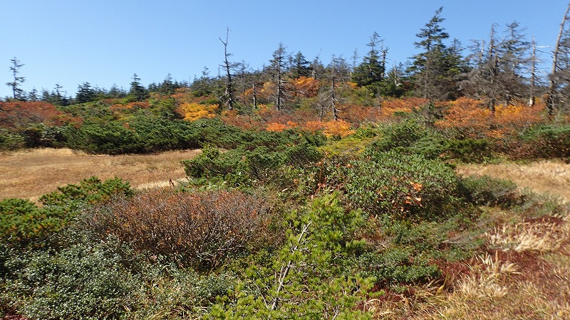 蔵王の紅葉の始まり=水引入道 2017年9月24日そろそろ蔵王の紅葉も時期になった、ということで、このところ毎年行っている水引入道に登ってきました。昨日とは打って変わり、晴天。ジャンボリーコースは、ブナ林の中で展望が全くないが、ひたすら登って、大日向に出ると、突然展望が開けてくるのが魅力です。 今年は8月に日照がなく、紅葉にどう影響するかな、と思っていましたが、素晴らしい紅葉が待っていました。水引入道は赤やオレンジが多く、水引平は、黄色に赤、緑が混じっています。 たっぷり紅葉を堪能した後、南屏風に上るか、水引に戻るか思案の結果、戻ることにしました。なんだか体が重いのです。行きに取ったジャンボリーコースを下りました。途中、水場があるのを発見。ガイドブックには書いていたが、どこかわからずに何度も通ったところです。湧水が苔の生えた岩の上に流れています。「ブナ林に水筒いらず」を絵にかいたようないい水場です。 東北地方は、これから1か月間紅葉が山を降りてきます。今年はどこの紅葉を見ようか、となんとも楽しみな季節です。