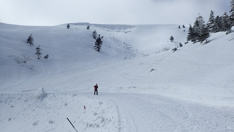 後烏帽子岳 2018年3月10日ガイド協会のイベントで後烏帽子岳に登りました。 一般参加者は16名、2班に分けて出発です。カモシカリフトの上のゲレンデが整地が終わっていないとのことで、途中待たされましたが、何とか出発。 東側は良く晴れて、仙台の町が見えていました。稜線に近づくと、強い西風。1時間余りで山頂に着きましたが、屏風岳は雲の中。時々、ちらりと姿を見せるのですが、すぐ隠れます。 強風のもとなので、下山開始。途中の斜面で、昼食休憩。 熊野岳は見えませんが、宮城側のロバの耳岩はよくみえていました。その後、カモシカリフト下、千年杉コースと辿りゴンドラハウスに3時に戻りました。