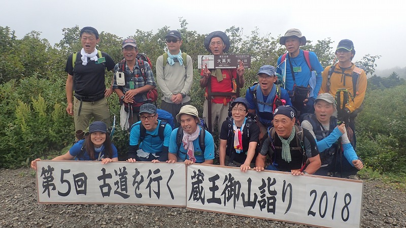 古道を行く第5回御山詣り 2018年8月25日いよいよ御山詣り本番になりました。心配していた台風も通過し、第1回以来4回続けて雨で始まった御山詣りも、初めて晴れからのスタート。3時に起き、3時半に会場で駐車場の案内係、4時からミーティング、4時45分開会式、5時にいよいよ出発しました。 これまで4回、遠刈田から頂上まで歩いてきましたが、今年は、裏方。車に乗り、道路の横断の誘導や、体験コースの開会式、その他の雑用を行いました。 前日の予報で、台風の余波で山の上に強風が吹くということでしたが、残念ながらその通りになって回復しませんでした。車で上がった山頂では、霧で視界が10数メートル。時折強風が吹きつけます。残念ながら、大黒天で打ち切り、ということになり、早まった下山のための手配に追われました。ちょうど最後のグループが大黒天に着くころに、大粒の雨。ギリギリセーフでしたが、なんとも残念な結果でした。 なかなか好天の一日、とはならないものです。来年こそは・・・・。