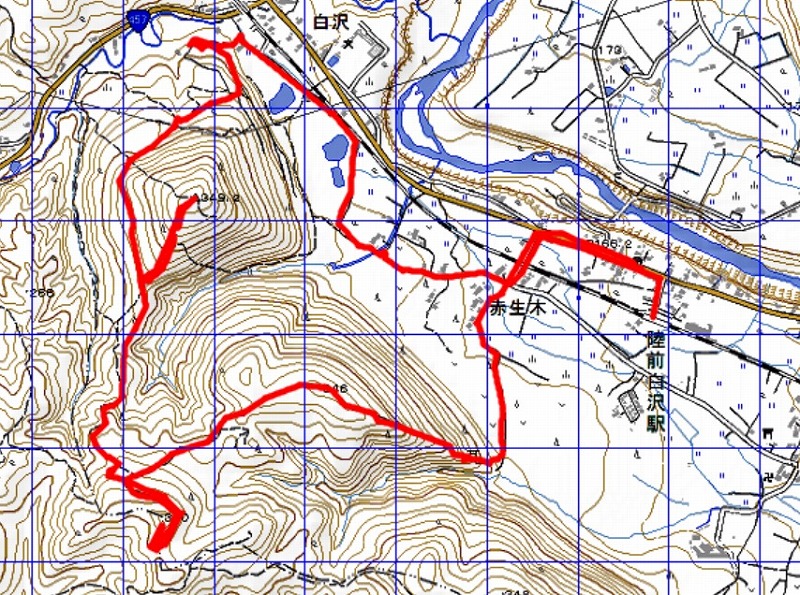 白沢五山 2018年12月13日かよう会の皆さんと、仙山線陸前白沢駅近くの、白沢五山を歩いてきました。 愛子までは本数があるのですが、山形まで行く列車は本数が少なく1時間に1本くらい。白沢駅は無人で、SUICAで入ると処理に困りました。 駅から国道46号線を少し歩き、左に見えてきます。白くなっており、うっすらと雪に覆われています。水道施設登山口から箱ノ倉山に向かいます。ところどころに赤布があります。標高348mの箱ノ倉山には三等三角点がありました。 続いてゴロ山。ここの分岐の手前で曲がり、少し藪を漕ぎましたが、正規の道に出て登山続行。ゴロ山は標高370mで本日の最高峰。山頂下で昼食。分岐点まで戻り、緩やかな道を通り前山に登りました。これを過ぎてからが急な坂道の下り。牛頭天王神社を過ぎると、急な階段の脇にジグザグな道があります。降りきって、イノシシ用の策を通ると、この日の行程が終了します。4時間少しの手ごろなハイキングコースでした。今日は3座に登りましたが、残りの2座にも行けるようです。