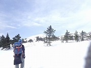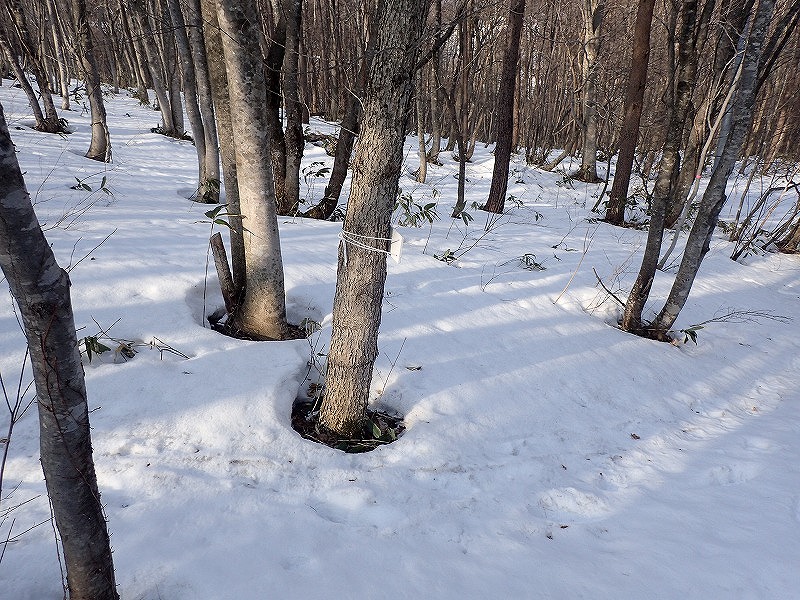 後烏帽子岳・再び 2019年3月5日3月に入り、移動性高気圧の天気になりました。雪が少ないまま、春になりましたという天気です。 えぼしスキー場のやまびこリフト上から、後烏帽子岳に向かいます。標高差320m、距離1.4㎞で頂上です。この道ははじめ緩やかで、標高1500mを越えると、結構急な道になります。家を出たのが9時過ぎ。ゴンドラで石子ゲレンデへ、そして、やまびこリフトで標高1360mまで行きます。ゴンドラはシニア割引で1000円、 リフトは400円です。夏道なら3時間かかるところ。 雪は締まっており、歩きやすい道です。高度を上げるにつれて見晴らしがよくなっていきます。町が見えてきます。太平洋はぼんやり霞んで見えません。春の天気です。次第に大東岳などの山が見えてき、ついに熊野岳刈田岳が見えてくると、もうすぐ山頂。少し傾斜が緩やかになり、前烏帽子への尾根に着くと、到着です。1時間45分で山頂。山頂からは、目の前の白い屏風岳、その左に不忘山、水引入道、馬ノ神岳、前烏帽子岳。また右側に杉ヶ峰、前山、刈田岳、熊野岳。ただ今日は、山形側から雲が流れて来て、青空は見えず、また太陽も隠れているので、山なみもぼやけています。それでも、望遠レンズを使うと、杉ヶ峰の樹氷帯、刈田岳南側の樹氷地帯などが見えます。 20分ほど写真を撮り、下山。クランポンを使いました。雪は締まっているので、踏み抜くことはほとんどありません。春山の雪です。50分でリフト終点。 ここからが大変です。ゲレンデ脇の急斜面を下りるのですが、雪はがりがりになっています。その上に薄い雪があります。クランポンを履いているので降りることができますが、ワカンやスノーシュ―では難しいでしょう。ここはゲレンデですが、もし、山の中でこういう斜面を下りることになったら、ピッケルが欲しいところです。ただ、下り始めると10分くらいで下りてしまいます。 1時半に、千年杉コース入り口。山頂を出て1時間10分です。ここから2㎞余りの緩い下りになりますが、雪質は悪くなります。ところどころに土やブッシュが出、雪もザクザクと崩れます。特に千年杉のあたりは、南斜面が雪が解けています。またその下も雪質は悪く、数歩に一度踏み抜く、悪路です。根開きが始まっています。雪がいい時より時間がかかります。1時間10分後の2時40分に、スキー場駐車場に着きました。歩いた距離6キロ余りの雪道でした。 このまま春になっていくのでしょうか。今年は、本当に雪が少ない年でした。