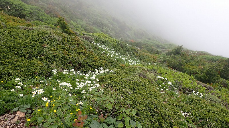 南蔵王縦走-今は花の縦走路 2019年6月9日ガイド協会主催の、南蔵王縦走に参加してきました。今、稜線は花盛り。いろいろな花が咲いています。朝、壊れていた登山届のふたを修理してから8時半に出発です。 刈田峠から杉ヶ峰までの区間には、タケシマラン、ミヤマハンショウヅル、オオバスノキ、ツリバナ、ツマトリソウなどを見ました。杉ヶ峰近くでは、雲海が見えました。芝草平入口には、残雪がありました。 芝草平には、ミネズオウやチングルマ、ヒナザクラも咲き始めていました。北屏風の登りではアズマシャクナゲがあり、北屏風山頂を過ぎて南屏風まで、たくさん咲いていました。 南屏風で昼食ののち、不忘山までの急な稜線は、それこそ、お花畑になっていました。ミヤマキンバイ、ユキワリコザクラ、ハクサンイチゲ、ミヤマオダマキ、シラネアオイなどです。 不忘山は雲の中でした、ここを過ぎて白石スキー場までの道は、昨年秋に整備されてずいぶん歩きやすくなっていましたが、濡れているので、滑る道でしたが、時間をかけて下り、4時にスキー場に着きました。こちらでは、アズキナシ、レンゲツツジ、サラサドウダンなど花盛りでした。