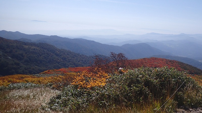 快晴の月山 2019年10月1日かよう会の皆さんと、月山に出かけました。私はこの数年、年2~3回は登って、好天の日もあったのですが、かよう会の皆さんはまともな日に登っていないそうです. 今日は、快晴の好天に恵まれました。駐車場から紅葉した山が見えています。 紅葉もどんぴしゃりで、一日中眼福の日でした。リフトで登りましたが、途中の景色も最高です。まず、姥ヶ岳への急な坂を登ります。道は整備されています。草紅葉と黄色、オレンジ色に紅葉したミネザクラが緑の笹と交じり合い、素晴らしい紅葉の中を進みます。 姥ヶ岳の山頂では、鶴岡の町と日本海が見えています。また、南側には、朝日連峰の山々が折り重なっています。やはり月山は日本海側の山だと実感できます。遠く蔵王も見えています。 金姥まで下り、登り返して牛首で休憩。いよいよ標高差270mの急な登りにさしかかります。大きな石が階段のように積まれ、歩きやすい道です。約1時間で頂上。途中の、ミネカエデのオレンジ色が鮮やかです。 町で昼食ののち、三角点へ。立派な一等三角点が置かれています。そこから少し北が最高地点。雄大な景色を堪能したのと下山開始。午後になり、日の当たり方が変わって、横からの日差しになるとまた一味変わった景色です。雲が出始めて、影と日向の色合いも印象的でした。花はあまりありませんが、タテヤマリンドウが印象に残りました。 大満足の紅葉の後、大井沢温泉で汗を流し、遠刈田に7時に戻りました。