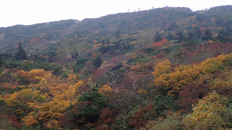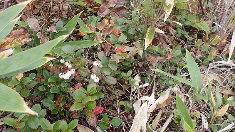 蔵王の紅葉は――御田の神湿地 2019年10月3日蔵王の山の紅葉も進んでいます。今日は、御田の神湿地に行ってきました。標高が1400mを越える大黒天から上は、紅葉が進んでいます。 あいにく、光がさしていないので色はいまいちなのですが、御田の神の紅葉風景です。ミネカエデやオオバスノキ、チングルマなどが赤や黄色に色を変えています。湿地を歩いてみて、チングルマやウメバチソウの花を見たり、シラタマノキやマイズルソウの白や赤の実に出会えました。
