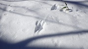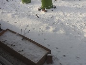 雪降り、キツネの足跡 2020年2月9日雪の少ない今年の冬ですが、朝うっすらと積もっていました。気温は零下3度。家の周りに、キツネの足跡が付いていました。一周したようです。