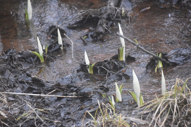 春爛漫ーザゼンソウを見に行く 2021年3月30日今日は、かよう会の皆さんとザゼンソウその他を見に行きました。場所は岩沼の金蛇水神社からグリーンピアへの道 金蛇水神社の入口は、きれいに姿を変えていました。そこに咲くサクラは満開。山道のほうへ足を向けると、キブシの花が咲いています。ショウジョウバカマの花も、カタクリも。 湿地に行くとお目当てのザゼンソウ。濃い茶色の花が何株か咲いています。隣にはミズバショウ。そして、キクザキイチゲの群落。 カタクリもニリンソウもありました。春真っ盛りでした。