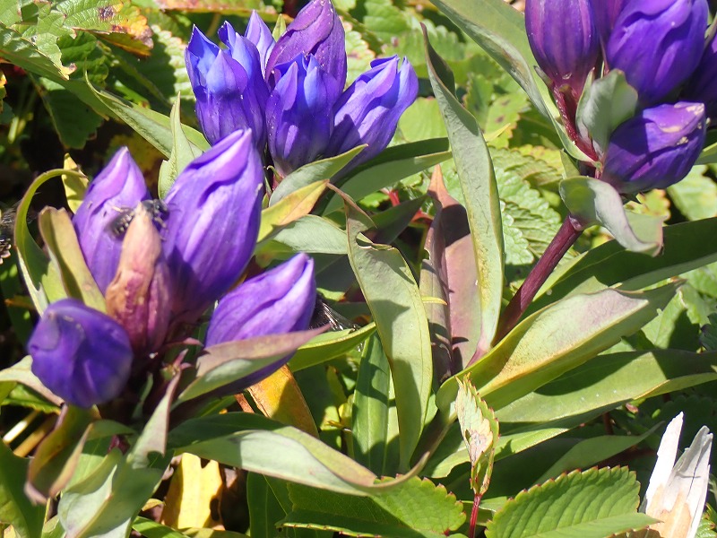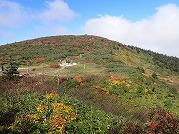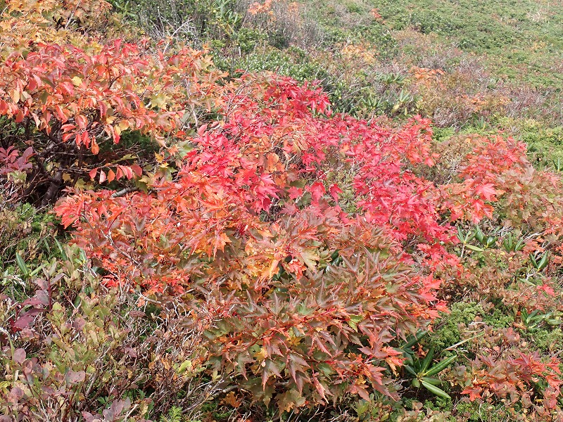 月山・紅葉の始まり 2021年9月14日月山に行ってきました。9月に入り、紅葉の始まりでした。 リフト駅に行く途中、ツルニンジンという植物の研究をしている人に会いました。根っこが朝鮮人参に似て薬になるそうです。 リフトに乗ると、ナナカマドが赤い実をつけています。 薄曇りの空のもと、姥が岳に登ります。ウメバチソウやミヤマリンドウなどの花が咲いています。姥が岳山頂からは、庄内平野と日本海。一面の草紅葉、ミネカエデなどの木々は紅葉を始めています。 ここから牛首へ。途中、夏の花も残っています。ハクサンイチゲ、イワショウブなどです。牛首からは急登の始まり。周りの木々は色づき始めていました。ちょうど昼に山頂。神社は営業を終えています。山小屋は営業中。昼食の後三角点。新しい標識が置かれていました。 ハクサンフウロやミヤマキンバイなどの夏の残りの花を見ながら、始まった紅葉の中を下ります。 エゾオヤマリンドウがいい色に咲いていました。