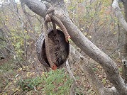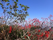 蔵王古道 峩々分岐~賽ノ磧 2021年10月19日かよう会の皆さんと、秋の蔵王古道を歩きました。ちょうど紅葉が見ごろの峩々分岐から賽ノ磧までの往復。 この辺りでは、林が色づき始めています。雲湧谷の展望も良好。手前になる赤い実をつけた木が気になりますが、近づくことができず、望遠カメラも持ってきていないので正体不明です。アオハダのような気もしますが。 オヤマボクチもドライフラワーになっています。一天名月の碑も紅葉の中。木札がクマに壊されていました。昨年つけた巻き道の看板もしっかりついています。シラタマノキも見ごろ。ガマズミの赤い実、ウリハダカエデの赤い葉など見頃です。 賽ノ磧では気温が7度。寒くなりました。