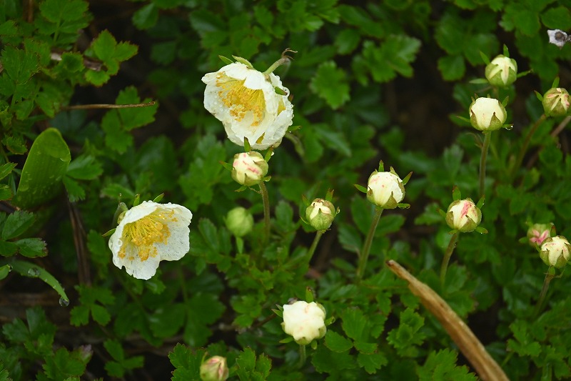 御田の神湿地は花盛り 2022年6月16日まあまあの天気になったので、御田の神に花を見に行きました。ちょうどこの辺りは雲の中。結構な風が吹いていました。 刈田駐車場から歩きます。途中アカヤシオツツジ。ミネザクラも咲いています。 入口では、恒例の看板の前に、チングルマの花。朝早いせいか、花は開ききっていません。イワカガミの花もちらほら。ミツバオウレンはたくさん咲いています。少し進むとヒナザクラの群落。ミネズオウも咲いています。ワタスゲは花が終わったばかり。 雪解けが遅いところのチングルマは蕾でした。ショウジョウバカマもちらほら。道端にはヤマハタザオ。 帰りにこまくさ平に寄りました。コマクサが咲き始めています。オキナグサも2株ほどありました。 いよいお山は、花の季節です。