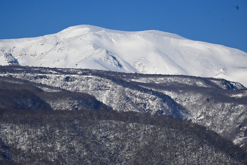 久々の晴天 2023年1月30日冬の期間、一か月に1,2度の快晴の日がやってきました。ただ当日は予定が入っており、麓から眺めるだけでした。 松川橋からの写真ですが、屏風岳や熊野岳は真っ白です。望遠レンズで取っているので 後烏帽子の山頂や熊野岳から自然園辺りには、樹氷が発達しているのが見えます。 青空の元の冬の蔵王連峰でした。本日は、昼に来月のイベントの下見にお不藤さんの森に積雪の状況を見に行きました。昨年より少なめとはいえ、イベント可能なだけしっかり積もっていました。