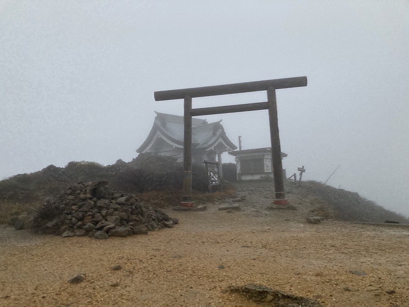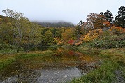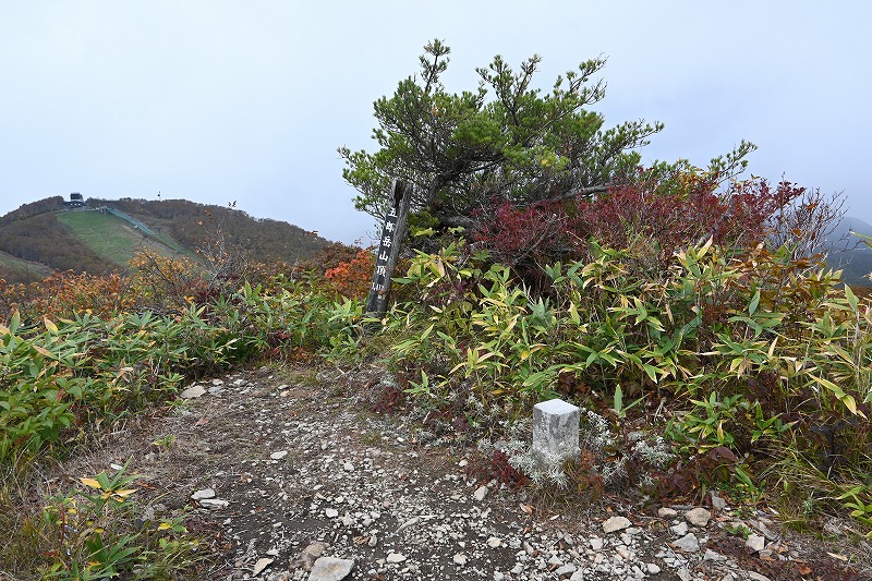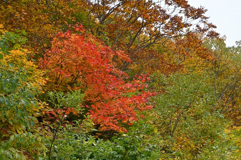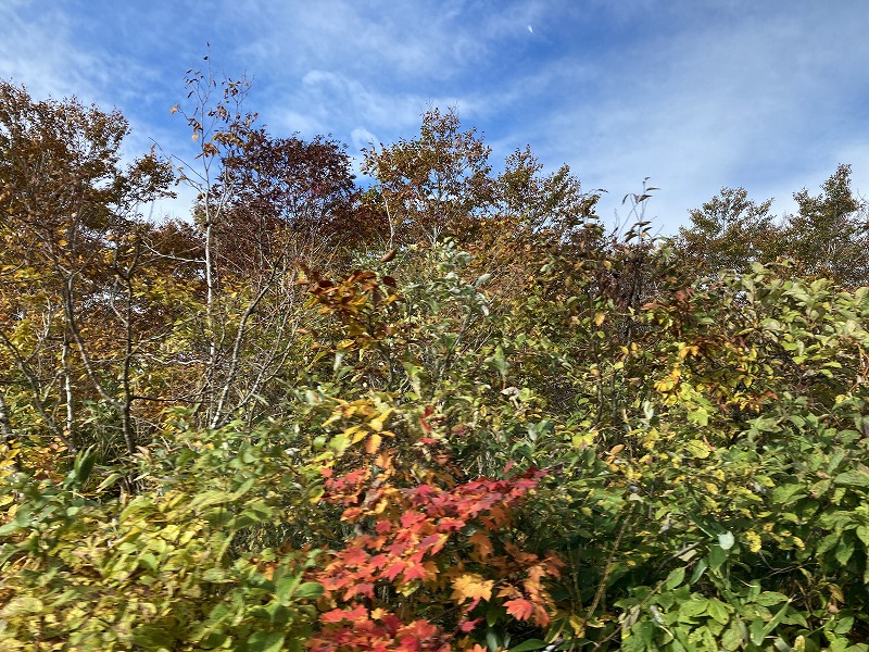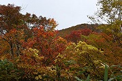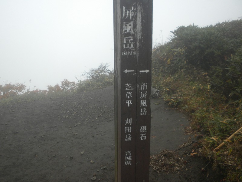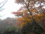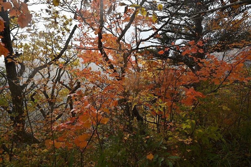北屏風へ 2025年10月7日かよう会は紅葉を見ながら北屏風へとなりました。てんくらはAでしたが、稜線は終日雲の中。刈田峠駐車場には車なし。この天気を嫌ったものでしょう。登山道独占です。 登山道に入ると、ミネカエデの紅葉が目につきます。多くは黄色ですが中にはオレンジ色のものも。まれにヤマザクラの赤も見られます。縦走路脇には、ヒロハヘビノボラズの赤い実も。 霧の中(雲の中)を前山を過ぎ、杉ヶ峰へ登り、芝草平へ。花はほとんどありませんが、ミヤマアキノキリンソウ、アザミがありました。芝草平ではチングルマが紅葉。 1時間弱で北屏風山頂へ。ここで昼食。下関からの単独縦走者に会いました。下半身は濡れています。硯石から上ってきたようですが、途中藪で濡れたそうです。北屏風から先は刈払いされていなく、藪です。 12時過ぎに下山開始。途中の後烏帽子への登山道は閉鎖中でした。その後もずっと雲の中。6時間で往復を完了しました。