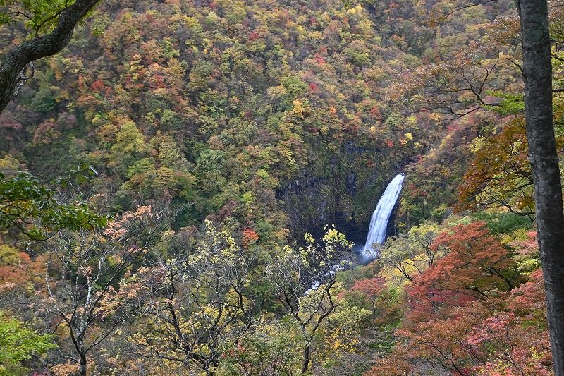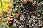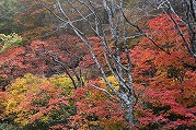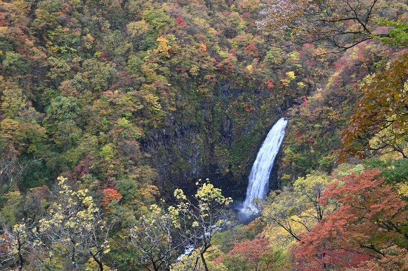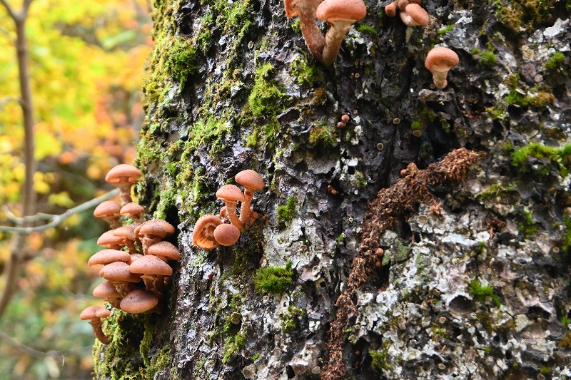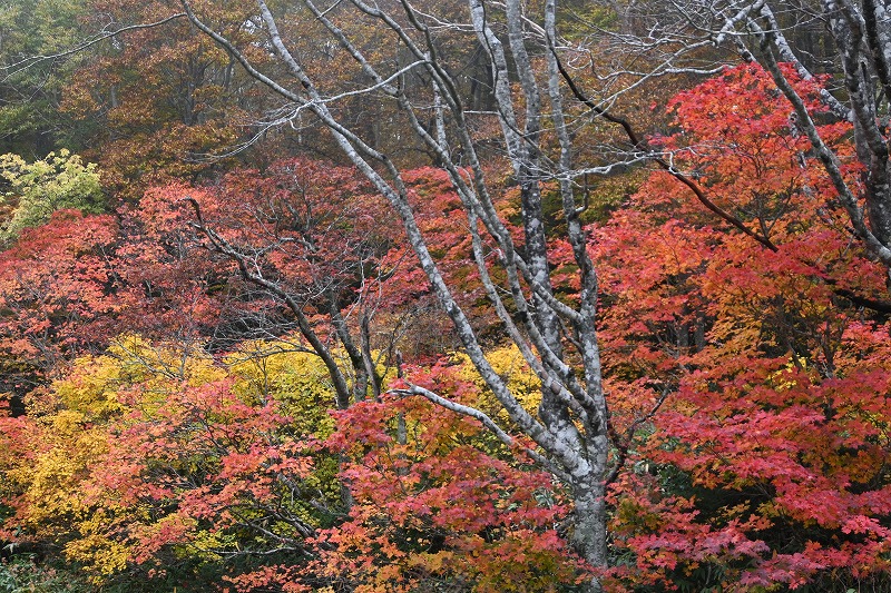 宮城蔵王の紅葉 2025年10月28日本日のかよう会は、宮城蔵王エコーラインの紅葉見物。前日のリサーチで、不動尊~スキー場が紅葉の見どころですので、すみかわスキー場から不動尊までの蔵王古道を下るルートを歩きました。 標高約1,000mのすみかわスキー場から、蔵王古道に入ります。落葉がたくさんで山道を埋め尽くします。一天名月は歩きにくいのでパス。巻道を下ります。 途中、オレンジの木々が。雲湧谷は霧がかかり幻想的でした。ここからウリハダカエデの赤色が目立ちます。色鮮やかな森の道です。途中キノコも出現。クリタケなどのほかあまり見かけぬスッポンダケなども初めて見ました。 不動尊に到着。不動滝は、紅葉に彩られていました。お不動さんの森も、紅葉の真っ最中。宮城蔵王の紅葉を堪能しました。その後下山、遠刈田公民館調理室で芋煮会でした。