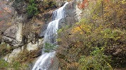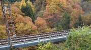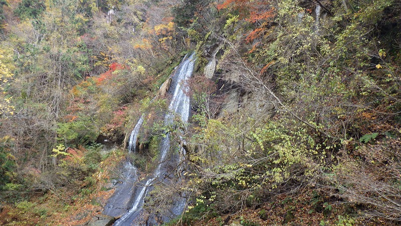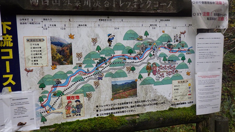 紅葉川渓谷と垂水遺跡 2025年11月11日今日のかよう会は、山形遠征。仙台駅から仙山線でスタート。山形県に入って面白山高原駅で下車。ここが、紅葉川渓谷歩きのはじまりです。 紅葉川に沿って渓谷につけられた道を下ります。周りは紅葉。幾つもの滝や奇岩を見ながら、吊橋を7回ほど渡り、岩につけられた道をたどるコースです。英文のパンフレットには、Momijigawa River Gorge,つまり紅葉川峡谷と書かれています。文字通り急な崖に挟まれた狭く深い谷です。前日の雨で落葉が濡れ、気の抜けないコースが続きます。 最後に、線路下のトンネルを抜け林道へ到着。1時間40分ほどかかりました。山寺まで5.8㎞と書かれています。 林道の途中から川に下り、鉄道と並行する道を歩きます。山寺近くになりあるのが山寺千手院歴史の道。垂水遺跡などがあります。「峰の浦やまでら天台の道」と書かれています。ここは、凝灰岩がくりぬかれた山伏の修業の場だったようです。ハチの巣状の穴が開いていますがその成因は?白岩七岩という奇岩もあります。 一通りめぐって、山寺の参道に出ます。ここで昼食。山形芋煮蕎麦をいただきました。その後15時28分発の電車に乗車。帰りは作並から車で送っていただき、17時過ぎに帰宅しました。